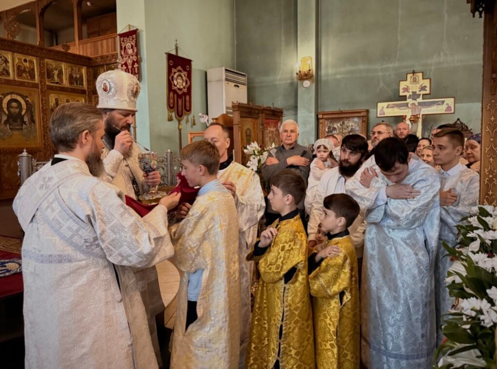 В этот день продолжается поклонение Плащанице Спасителя, вынесенной в центр храма. По традиции православные христиане приносят в храм для освящения куличи, пасхи и яйца. После богослужения во дворе монастыря архипастырь совершил чин освящения пасхальной снеди.